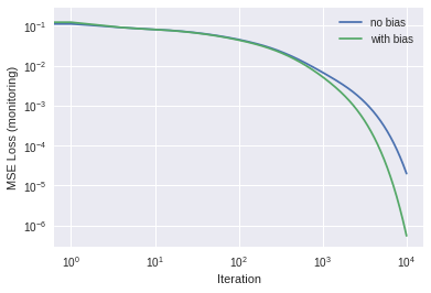 Y = np.array([[0,0,1,1]]).T # target output dataset def sigmoid(x,deriv=False): if(deriv==True):return x*(1-x)return1/(1+np.exp(-x))def calc_loss(Y_pred, Y, X, w, activ, loss_type="mse"): # MSE loss diff = Y_pred - Y loss = (diff**2).mean() gradient = np.dot( X.T, diff*activ(Y_pred, deriv=True)) # for weight updatereturn loss, gradientdef fit(X, Y, activ, use_bias=True, alpha=3.0, maxiter=10000, loss_type='mse'):""" fit: Generic routine for doing our gradient decent Required arguments: X: input matrix Y: target output activ: reference to an activation function Keywork arguments (optional): use_bias: Flag for whether to use bias in the model alpha: learning rate. Tip: Use the largest alpha 'you can get away with' maxiter: maximum number of iterations loss_type: Set to MSE for now but we'll extend this later. """if use_bias: # add a column of 1's to X new_col = np.ones((X.shape[0],1)) X = np.hstack((new_col,X)) # Define weights np.random.seed(1) # for reproducibility if activ == sigmoid: w =2*np.random.random((X.shape[1],Y.shape[1])) -1# -1..1 else: w = np.random.random((X.shape[1],Y.shape[1]))/10# only positive weights (for later) loss_hist = [] # start with an empty listforiterinrange(maxiter): Y_pred = activ(np.dot(X,w)) # compute prediction, i.e. tilde{Y} loss, gradient = calc_loss(Y_pred, Y, X, w, activ, loss_type) loss_hist.append(loss) # add to the history of the loss w -= alpha * gradient # weight updatereturn w, Y_pred, loss_hist # send these values back# Now call the fit function twice, to compare with and without bias:w_old, Y_pred_old, loss_hist_old = fit(X, Y, sigmoid, use_bias=False)w_new, Y_pred_new, loss_hist_new = fit(X, Y, sigmoid)# Plot the results. Make a function so we can call this again laterdef plot_new_old(loss_hist_old, loss_hist_new, labels=["no bias", "with bias"]): plt.loglog(loss_hist_old, label=labels[0]) plt.loglog(loss_hist_new, label=labels[1]) plt.xlabel("Iteration") plt.ylabel("MSE Loss (monitoring)") plt.legend() plt.show()plot_new_old(loss_hist_old, loss_hist_new)# And print the final answers:print("No bias: Y_pred =",Y_pred_old)print("With bias: Y_pred =",Y_pred_new)