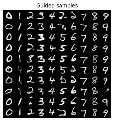 From the “random” distribution of generated digits, we see that this is an unconditional generative model: there’s nothing determining the classes of the outputs – until we add guidance, below! ;-) In a short while, we’ll reproduce that diagram, but we’ll use guidance to get one class per sample, in order, along the diagonal.