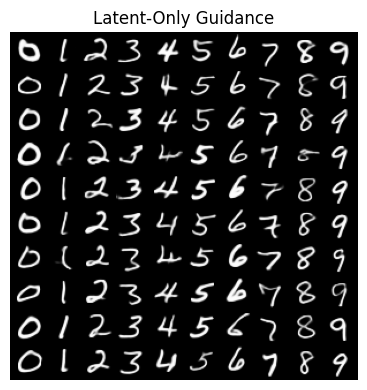 We looked at four approaches. First, standard classifier guidance in pixel space—it works but it’s slow because you’re propagating gradients through the VAE decoder. Second, we trained a simple latent-space classifier and did the same thing much faster. Third, we implemented the linear inpainting method from Pokle et al, which operates directly on latents. Fourth, we tried PnP-Flow, which achieves guidance not by correcting velocities but by iteratively projecting samples forward and backward in time.