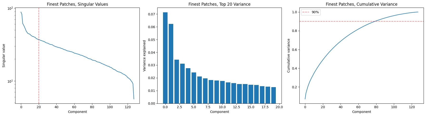 Finest Patches,: 80 components for 90% variance, top-1 explains 7.1%