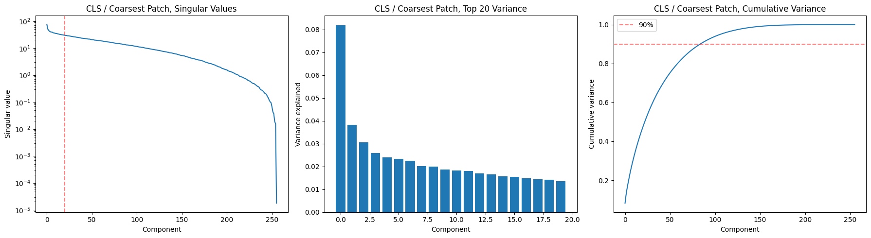 CLS / Coarsest Patch,: 85 components for 90% variance, top-1 explains 8.2%
