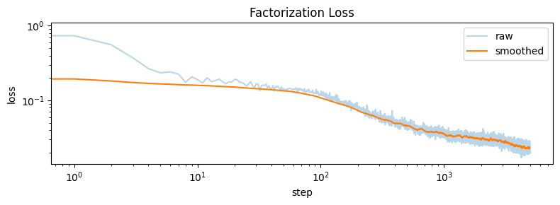 The factorization objective works well. After training for 5,000 steps with batch size 1024 and lr=4e-3: