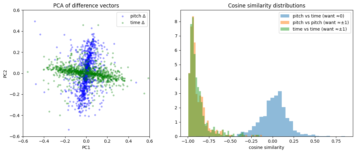 from sklearn.decomposition import PCAall_diffs = torch.cat([pitch_d, time_d], dim=0).numpy()labels = ['pitch'] *len(pitch_d) + ['time'] *len(time_d)pca = PCA(n_components=2).fit(all_diffs)proj = pca.transform(all_diffs)fig, axes = plt.subplots(1, 2, figsize=(12, 5))# PCA scatter all_diffs = torch.cat([pitch_d, time_d], dim=0).numpy()pca = PCA(n_components=2).fit(all_diffs)proj = pca.transform(all_diffs)n =len(pitch_d)axes[0].scatter(proj[:n, 0], proj[:n, 1], alpha=0.3, s=10, label='pitch Δ', c='blue')axes[0].scatter(proj[n:, 0], proj[n:, 1], alpha=0.3, s=10, label='time Δ', c='green')axes[0].set_xlabel('PC1'); axes[0].set_ylabel('PC2'); axes[0].legend()axes[0].set_title('PCA of difference vectors'); axes[0].set_aspect('equal')# Histogram with all three distributionsax = axes[1]ax.hist(cos_cross, bins=40, alpha=0.5, label='pitch vs time (want ≈0)', density=True)ax.hist(np.concatenate([ps, ts]), bins=40, alpha=0.5, label='same-sign (want ≈+1)', density=True)ax.hist(np.concatenate([po, to_]), bins=40, alpha=0.5, label='opp-sign (want ≈−1)', density=True)ax.set_xlabel('cosine similarity'); ax.legend(); ax.set_title('Cosine similarity distributions')plt.tight_layout(); plt.show()print(f"target=+0: mean cos={cos_cross.mean():.3f}, mean |cos|={np.abs(cos_cross).mean():.3f}")print(f"target=+1: mean cos={np.concatenate([ps,ts]).mean():.3f}, mean |cos|={np.abs(np.concatenate([ps,ts])).mean():.3f}")print(f"target=-1: mean cos={np.concatenate([po,to_]).mean():.3f}, mean |cos|={np.abs(np.concatenate([po,to_])).mean():.3f}")