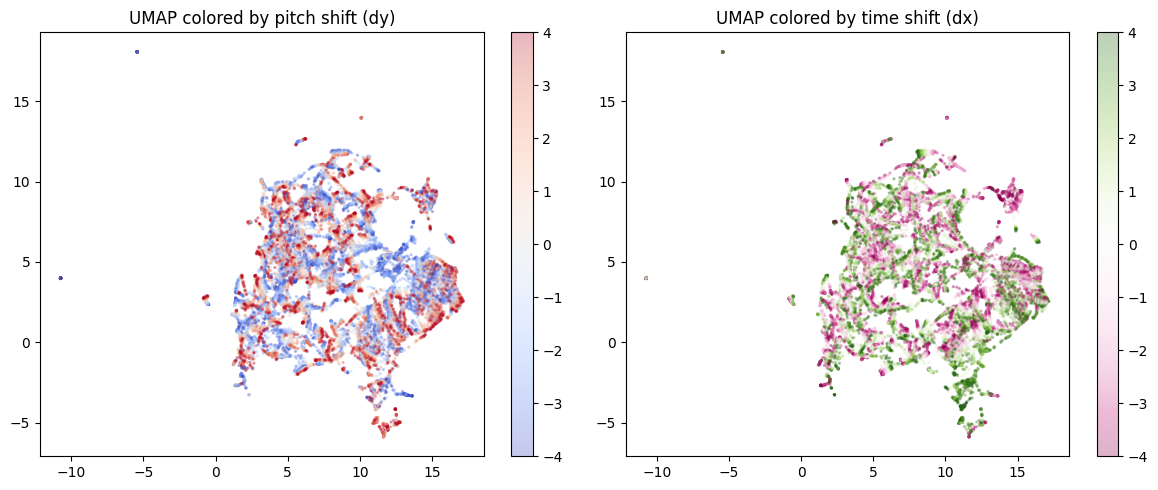 The PCA of difference vectors shows a clear cross shape, confirming pitch and time directions are approximately orthogonal in the learned latent space. The remaining ~17° deviation from perfect anti-parallelism is attributable to the asymmetric zero-padding introduced by shift_no_wrap (see probing section below).