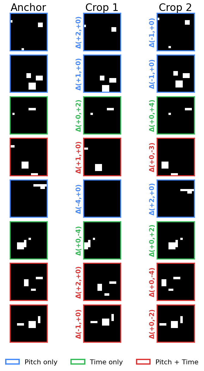 We use our explicit data augmentation of translations and pitch and time and feed those as labels into a loss function to try and encode those operations geometrically. Add this loss function to an encoder and see if it achieves a soft factorization of pitch and time: