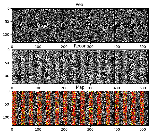 grid_recon, grid_real, grid_map, evals = viz_mae_recon(recon, img_real, enc_out=enc_out, epoch=0, debug=True, return_maps=True)